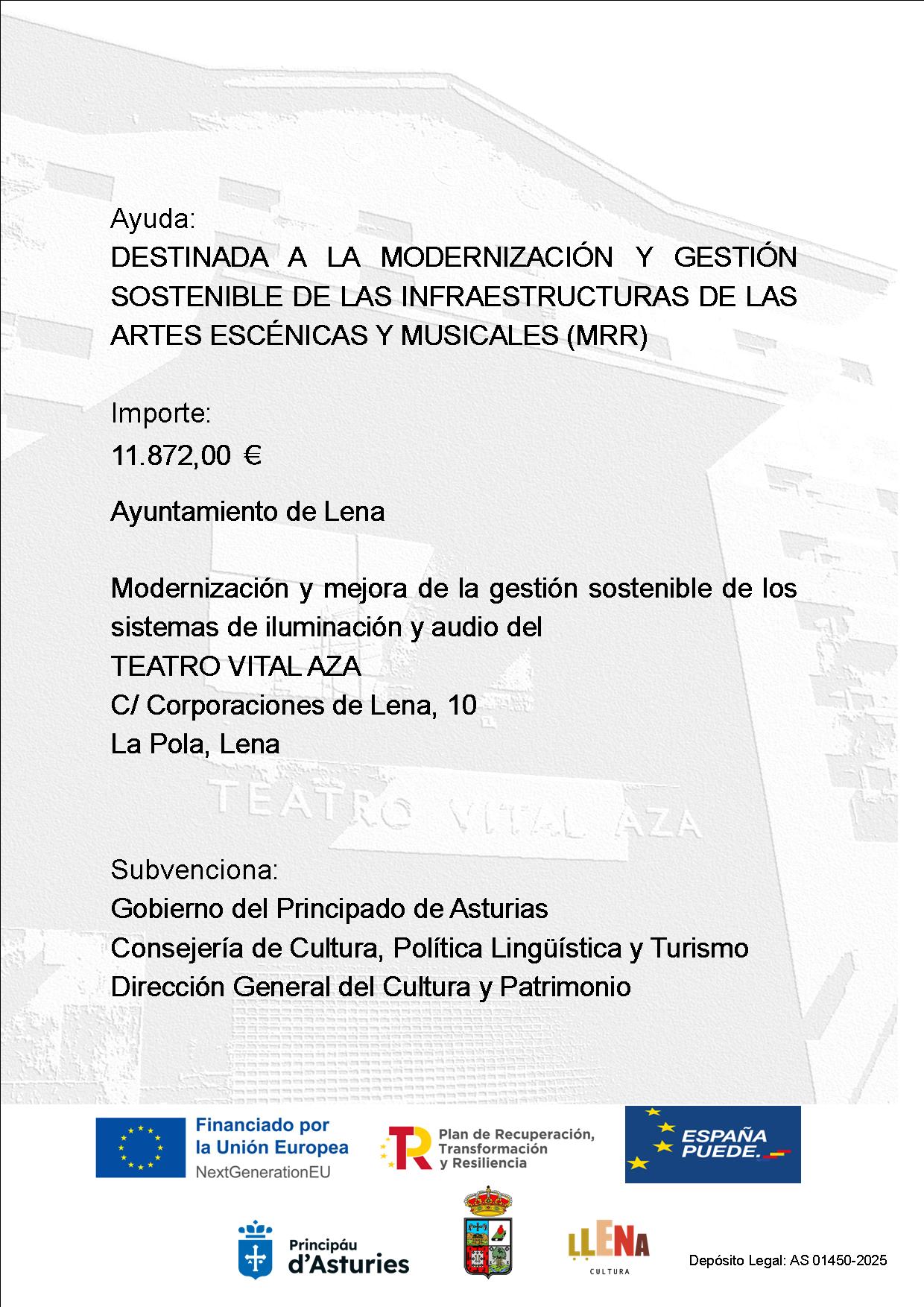 El Ayuntamiento de Lena recibirá una ayuda de 11.872 euros del Gobierno del Principado de Asturias, a través de la Consejería de Cultura, Política Llingüística y Deporte, para llevar a cabo un proyecto de modernización de la iluminación y el sistema de audio del Teatro Vital Aza.