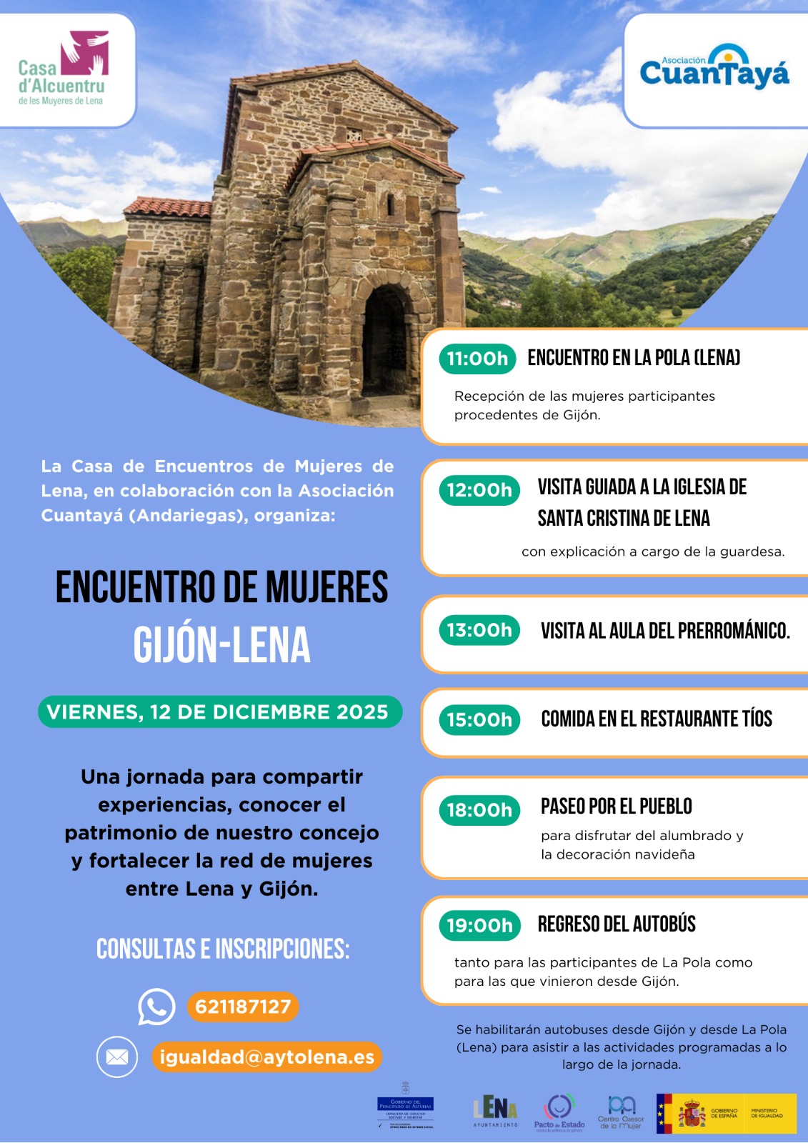 La Casa de Encuentros de Mujeres de Lena, en colaboración con la Asociación Cuantayá (Andariegas), celebrará el próximo viernes, 12 de diciembre de 2025, el Encuentro de Mujeres Gijón–Lena, una jornada pensada para compartir experiencias, fortalecer redes de apoyo y poner en valor el patrimonio cultural lenense.