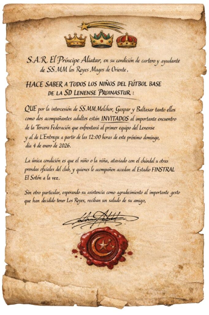 El mensaje, firmado por el Príncipe Aliatar, cartero y ayudante de Sus Majestades de Oriente, anuncia que todos los jugadores y jugadoras del fútbol base del Lenense podrán acudir gratuitamente, junto a dos acompañantes adultos, al partido de Tercera Federación que enfrentará al conjunto verdiblanco con el L’Entregu. El encuentro se disputará este domingo 4 de enero, a partir de las 12:00 horas.
