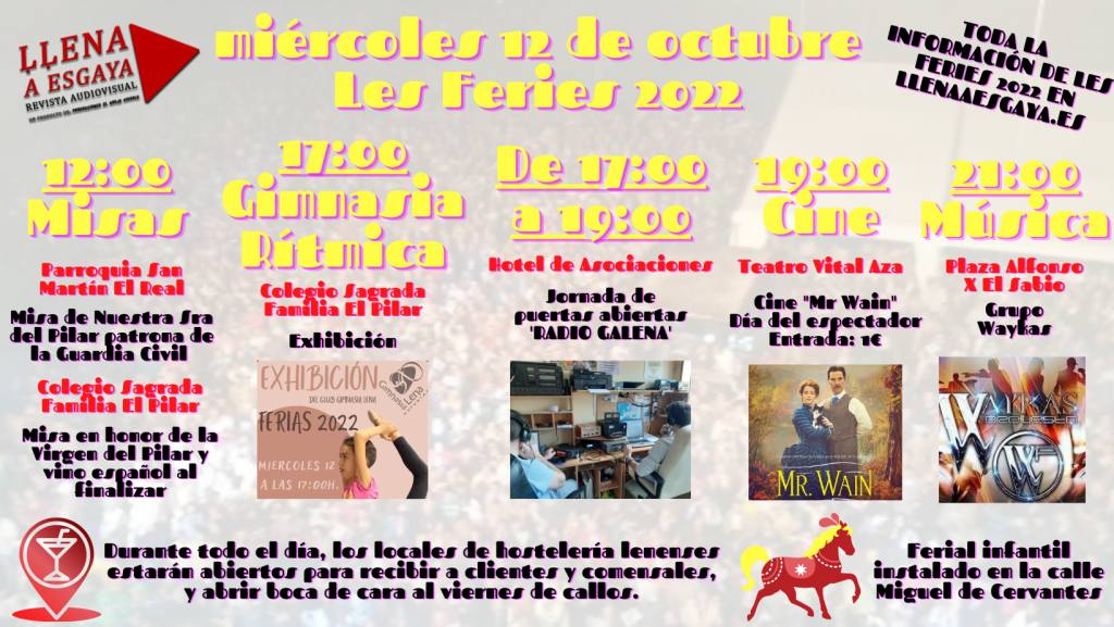 Tras un martes en el que la fiesta se habrá alargado hasta bien entrada la madrugada, el miércoles comenzará con los oficios religiosos, a las doce del mediodía. En la Parroquia San Martín El Real se celebrará la Misa de Nuestra Señora del Pilar, patrona de la Guardia Civil. Por su parte, a la misma hora, pero en el Colegio Sagrada Familia El Pilar, tendrá lugar la misa en honor de la Virgen del Pilar, al finalizar habrá un vino español.