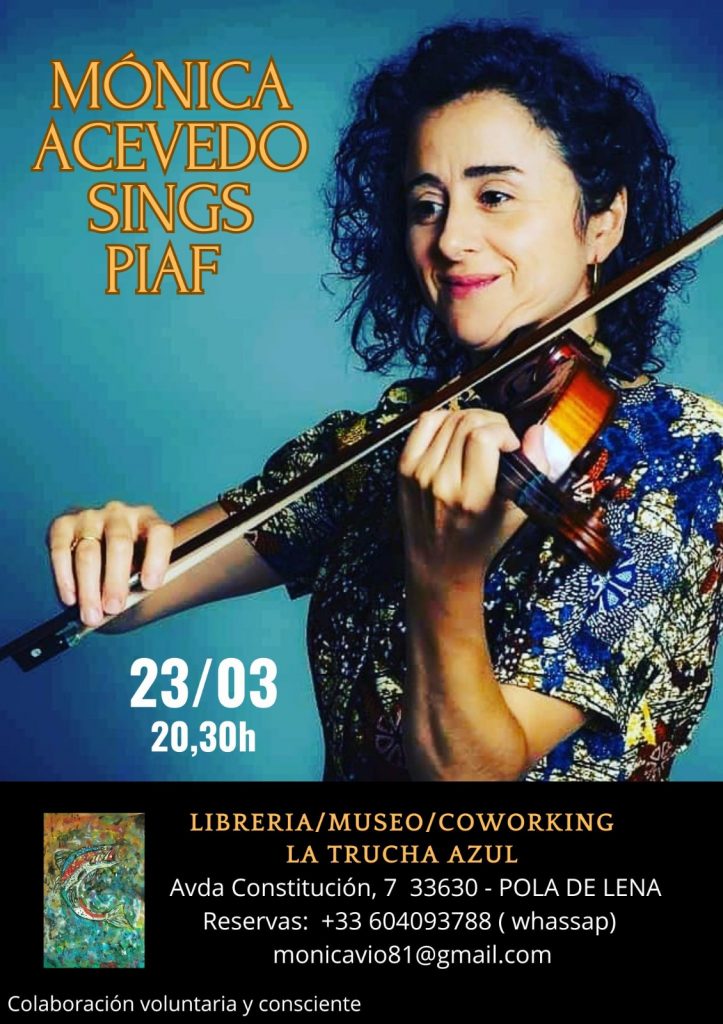 Este sábado 23 a las 20:30 horas, primer acto en el nuevo espacio coworking/museo/librería en La Pola. ‘La Trucha Azul’, donde adelantan que programarán presentaciones artísticas de todo tipo. Mañana, ‘Mónica Acevedo Sing Piaf’. El espacio se encuentra en la Avenida Constitución, nº7, en La Pola (L.lena).