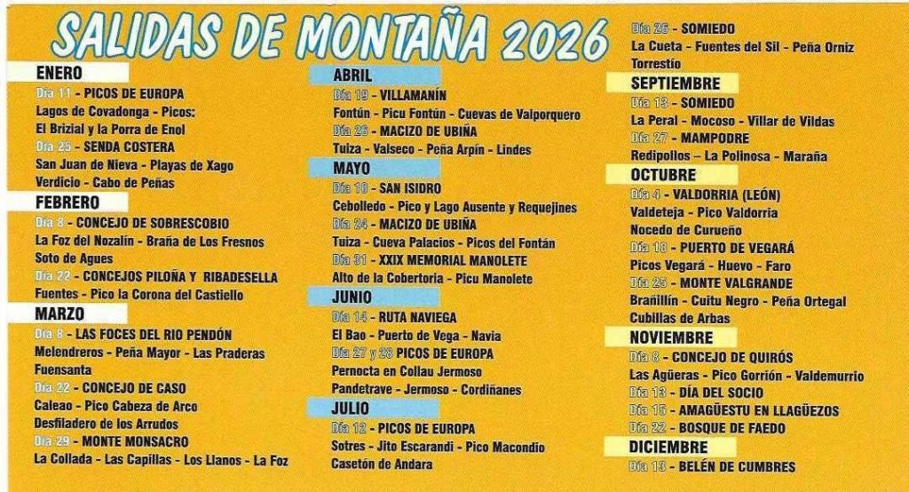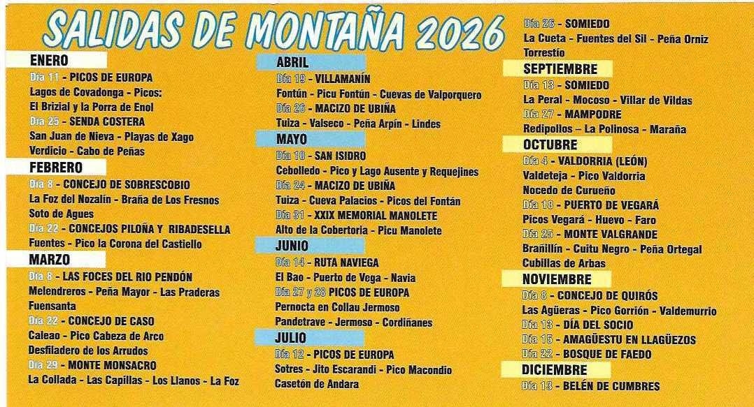La propuesta para el próximo año incluye rutas repartidas a lo largo de los doce meses, combinando salidas de media y alta montaña, recorridos costeros, travesías clásicas y citas ya consolidadas dentro del calendario del grupo. El objetivo, un año más, es fomentar el montañismo, el contacto con la naturaleza y la convivencia entre los participantes.