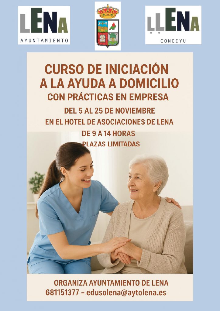 El Ayuntamiento de Lena/Ḷḷena organiza una nueva edición del Curso de Iniciación a la Ayuda a Domicilio, una propuesta formativa gratuita que ofrece formación teórica y prácticas en empresa para quienes deseen iniciarse en este sector profesional.