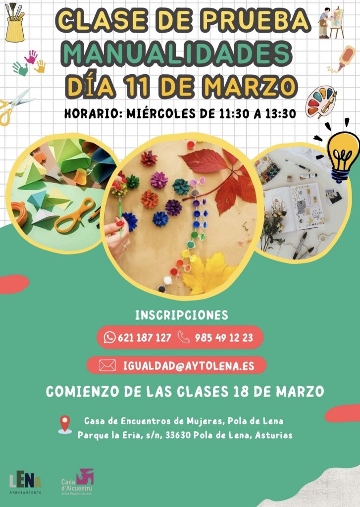 La Casa de Encuentro de Mujeres de Lena, ubicada en el Parque de La Ería de Pola de Lena, acogerá el próximo miércoles 11 de marzo una clase de prueba de manualidades, una iniciativa pensada para fomentar la creatividad y el encuentro social.