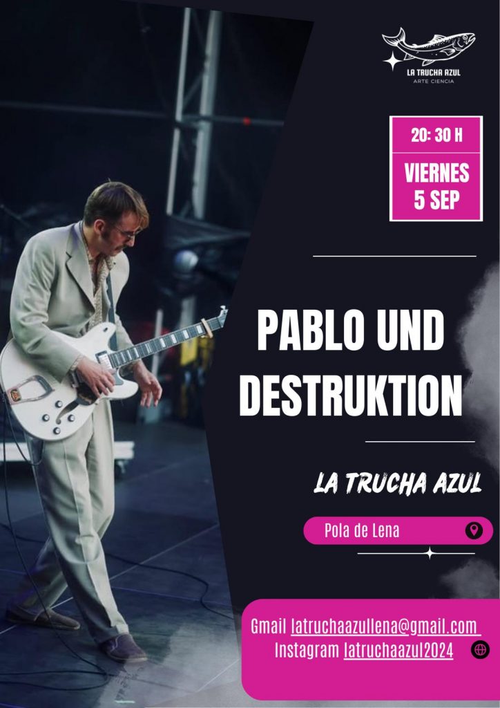 La Trucha Azul vuelve a abrir sus puertas a la música en directo con uno de los nombres más singulares de la escena asturiana: Pablo Und Destruktion. El concierto será este viernes 5 de septiembre a las 20:30 horas en el espacio cultural La Trucha Azul.