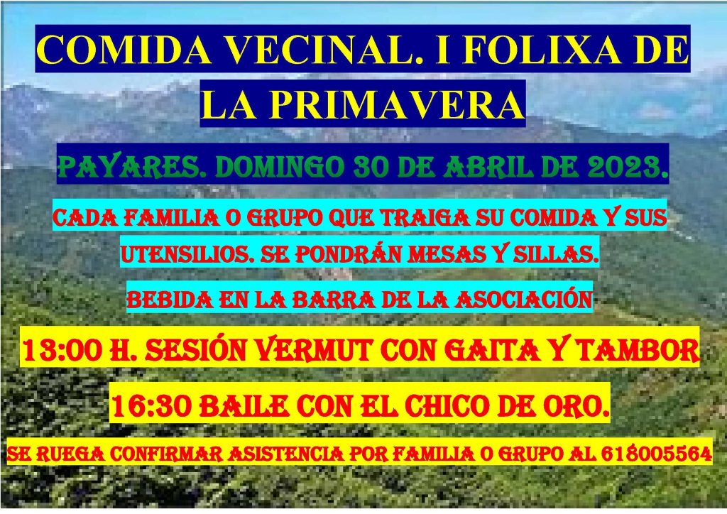 La localidad lenense de Payares se prepara para celebrar, el próximo 30 de abril, una comida vecinal en la que será la ‘I Folixa de la primavera’. Organizada por la Asociación de Vecinos de Payares, el programa incluye sesión vermú o baile.