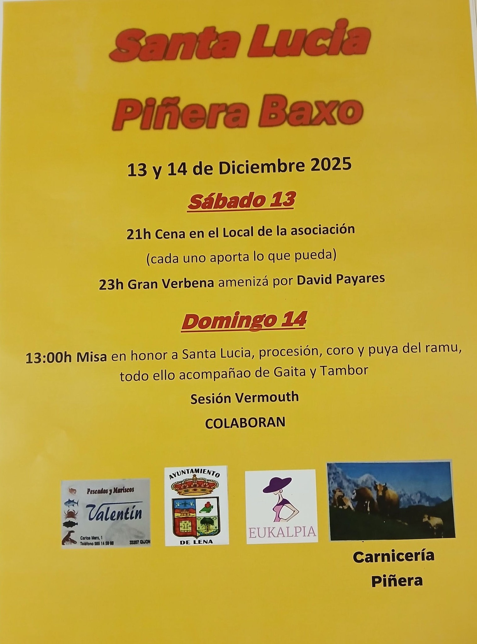 El pueblo de Piñera Baxo se prepara para festejar Santa Lucía el fin de semana del 13 y 14 de diciembre, con un programa que combina tradición, convivencia vecinal y música.