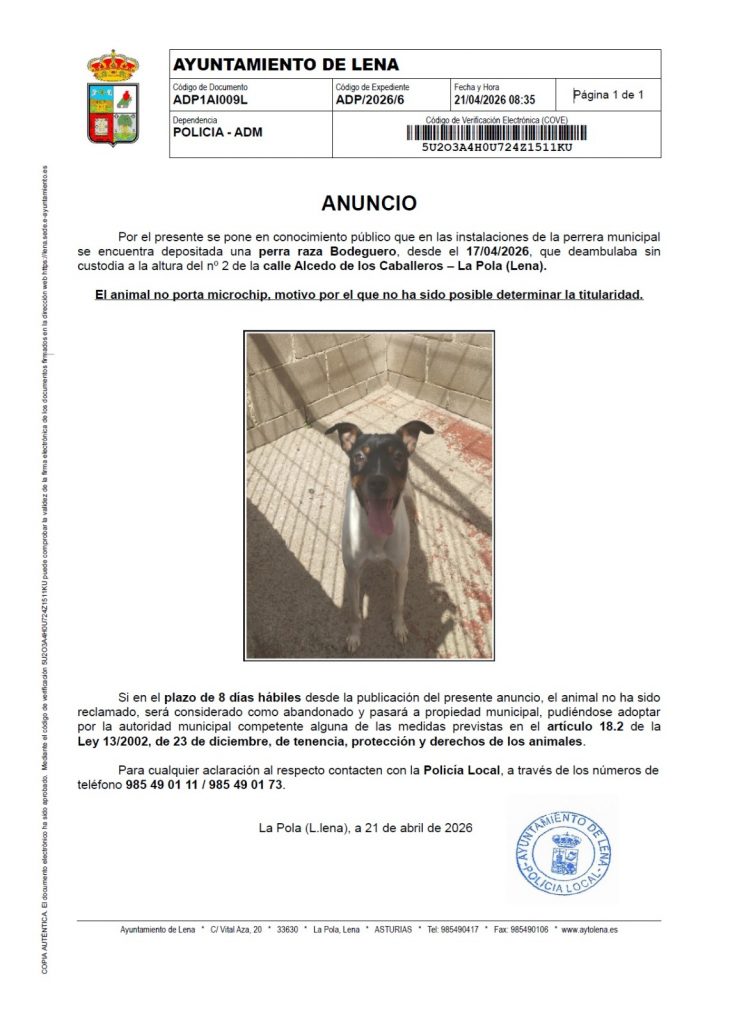 La Policía Local de Lena ha hecho público un aviso tras la recogida de una perra de raza bodeguero que fue localizada deambulando sin custodia en La Pola.