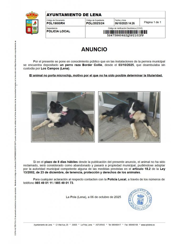Desde el consistorio se recuerda que cualquier persona que pueda aportar información o reclamar la titularidad del animal debe ponerse en contacto con la Policía Local de Lena, llamando a los teléfonos 985 49 01 11 o 985 49 01 73.