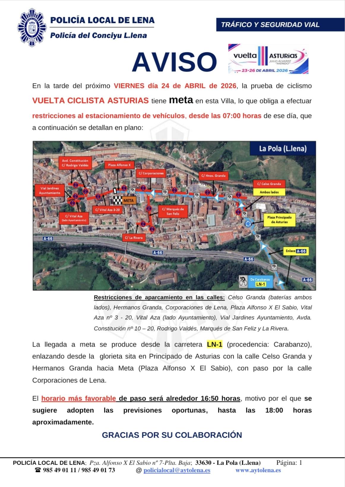 La Policía Local de Lena ha informado de las restricciones de tráfico y estacionamiento que afectarán al casco urbano de La Pola este viernes 24 de abril, con motivo de la llegada de la Vuelta Ciclista a Asturias, que tendrá meta en la villa.