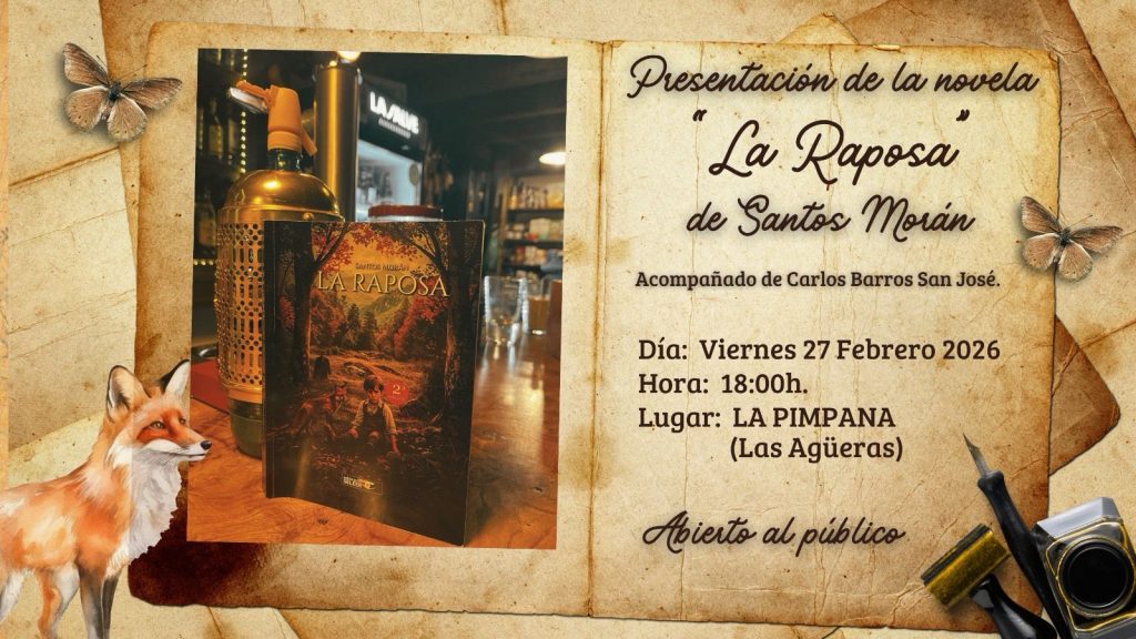 El escritor lenense Santos Morán presentará este viernes 27 de febrero, a las 18:00 horas, su novela La raposa en La Pimpana – Chigre Tienda, en Las Agüeras, Quirós.
