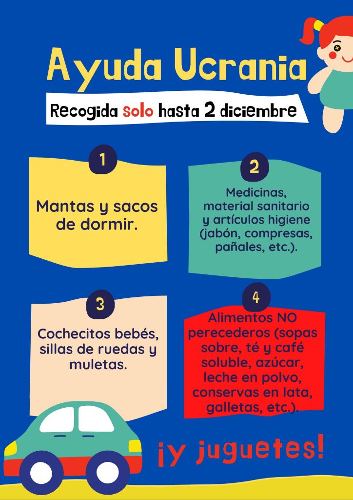 Si bien el punto se ha abierto con motivo de la campaña de navidad y para recoger juguetes, aprovechando los envíos también se recoge material humanitario (mantas y sacos, medicinas y material sanitario, productos de higiene, sillitas bebés, sillas de ruedas y muletas, alimentos no perecederos tipo sopas de sobre, té, café soluble, azúcar, galletas, leche en polvo y conservas).