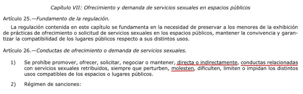 Desde la asociación critican duramente el redactado del artículo 26, que prohíbe, entre otras cosas, «conductas relacionadas con servicios sexuales retribuidos» siempre que «perturben, molesten, dificulten, limiten o impidan» el uso de los espacios públicos.