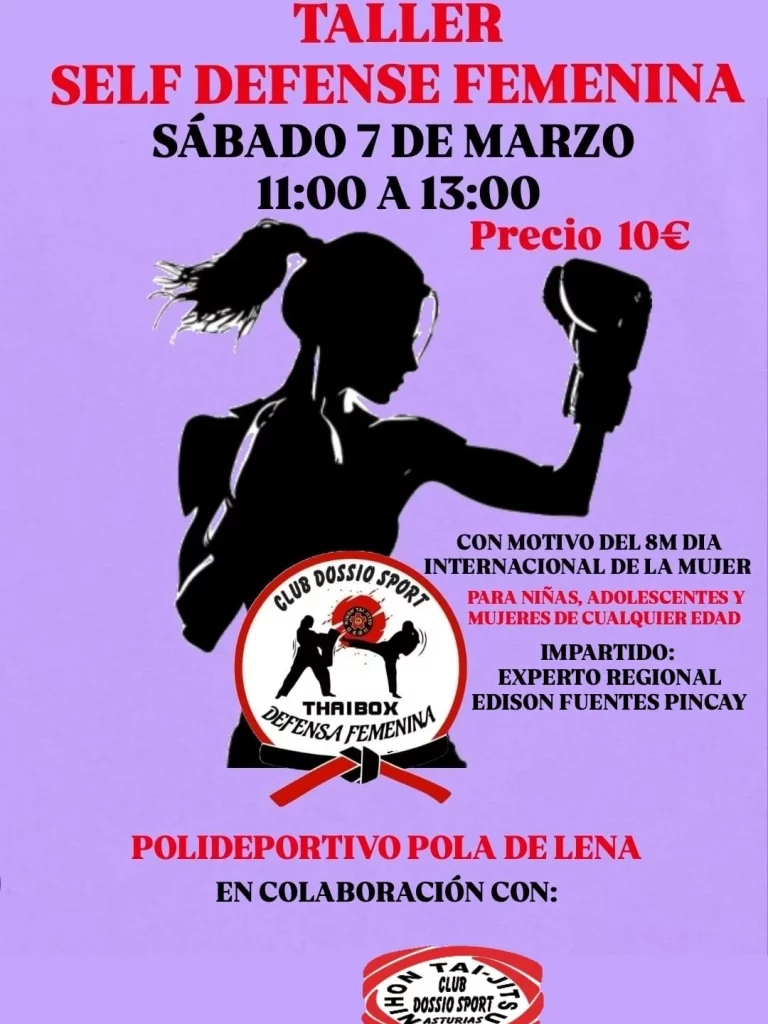 El Polideportivo de Pola de Lena acogerá el próximo sábado 7 de marzo, de 11:00 a 13:00 horas, un taller de self defense femenina organizado por el Club Dossio Sport, con motivo del Día Internacional de la Mujer (8M).