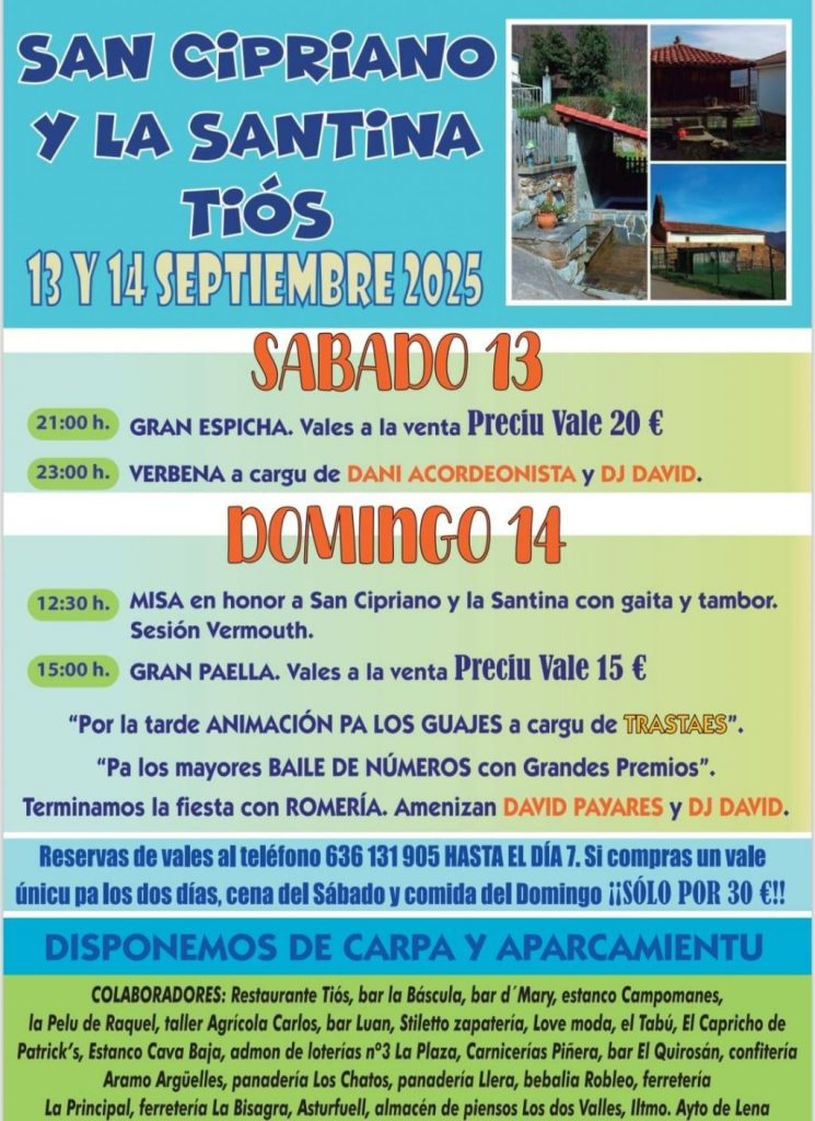 El pueblo de Tiós se prepara para vivir este fin de semana, 13 y 14 de septiembre, sus tradicionales fiestas en honor a San Cipriano y la Santina, con un programa que combina gastronomía, música, actividades para todas las edades.