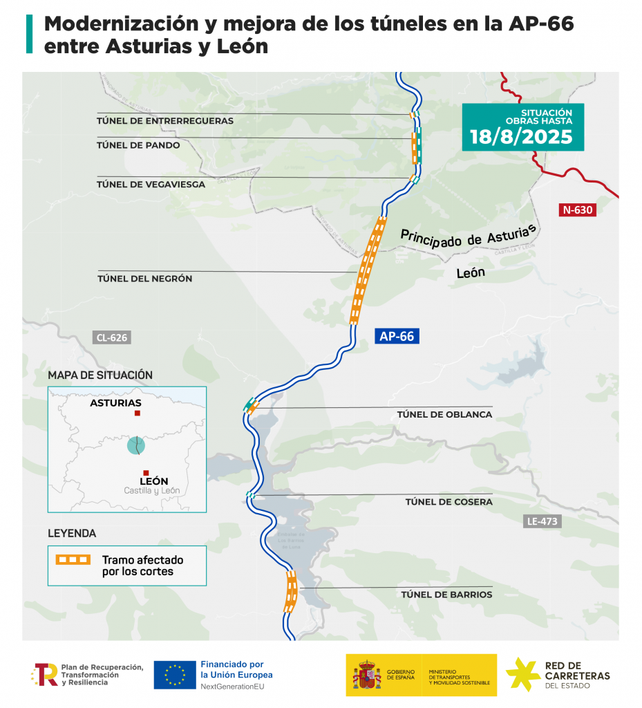 El Ministerio de Transportes y Movilidad Sostenible está ejecutando obras de modernización en varios túneles de la autopista AP-66 (León – Campomanes), entre ellos los de Entrerregueras, Pando, Vegaviesga, Negrón, Oblanca, Cosera y Barrios, con un presupuesto total de 68,14 millones de euros. Estas actuaciones están enmarcadas en el Plan de Recuperación, Transformación y Resiliencia, financiado con fondos NextGenerationEU.