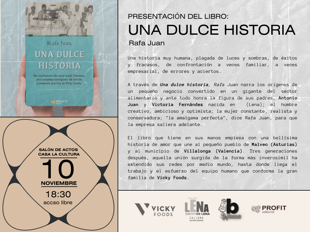 El autor del libro, Rafa Juan, consejero delegado del grupo internacional de alimentación y distribución Vicky Foods, acudirá a La Pola el próximo jueves para realizar la presentación de el libro. En el mismo, de primera mano cuenta la historia de ‘Dulcesol’, actualmente bajo la marca de ‘Vicky Foods’. Ese nombre actual de la empresa, con ese ‘Vicky’ ya nos da pistas de la importancia que la lenense Victoria Fernández (de Malveo) tuvo en la empresa.