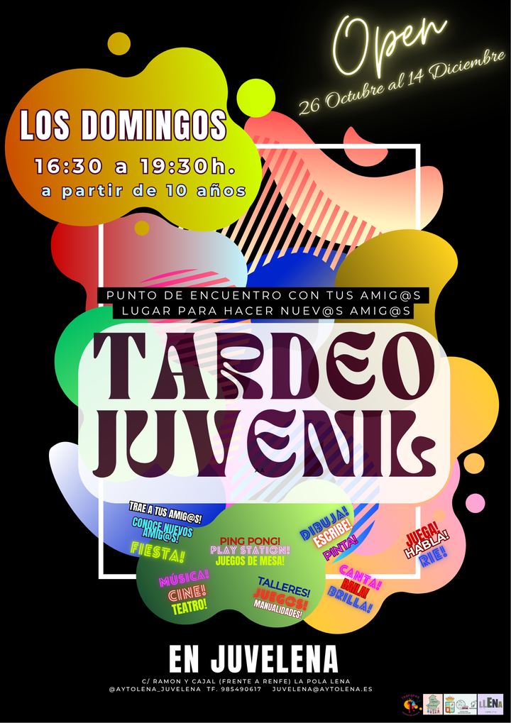 Durante las tardes de domingo, las instalaciones de Juvelena se abrirán como punto de encuentro para jóvenes, donde podrás venir con tus amigos o hacer nuevos. Habrá un montón de actividades —🎮 juegos de mesa, ping pong, PlayStation, talleres, música, cine, teatro, manualidades y mucho más—, y además, ¡tú también podrás proponer las tuyas!